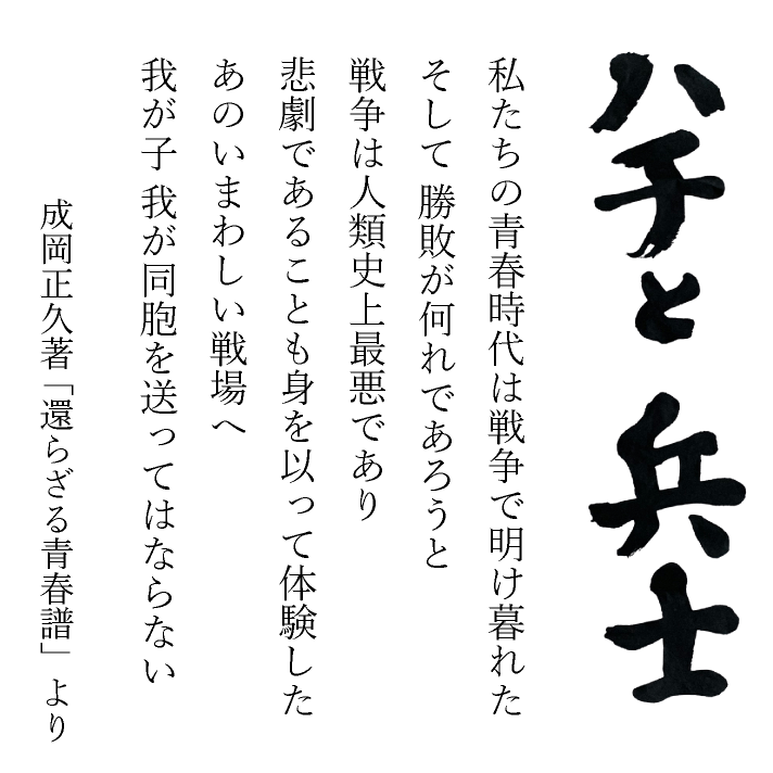 台座には「私たちの青春時代は戦争で明け暮れた」という成岡さんの言葉が刻まれ、二度と戦争の悲劇を繰り返さないというメッセージを伝えていきます。