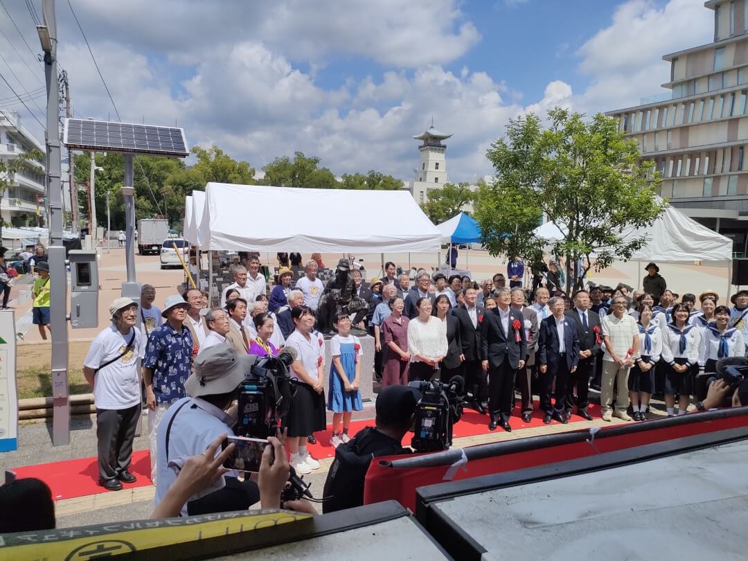 今後、この像の台座に刻まれた成岡さんの反戦の思いや、ハチの生い立ちは多言語されてQRコードで読み込むことができるようになる。