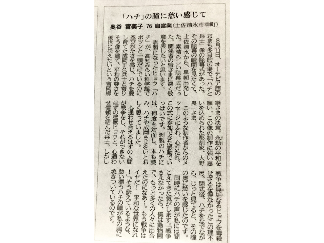 「ハチと兵士の像」除幕式 ― 高知新聞に寄せられた声 先日、高知新聞に「ハチと兵士の像」の除幕式に関する感想文が掲載されました。 式に立ち会った方の思いが紙面で紹介されています。 高知新聞 2025年8月28日 Share! ≪ 前の記事 「ハチと兵士」の像の除幕式が盛大に 「ハチと兵士」の像の建立に寄せて 白井 真佐子 次の記事 ≫ (C)ハチの像を建てる会